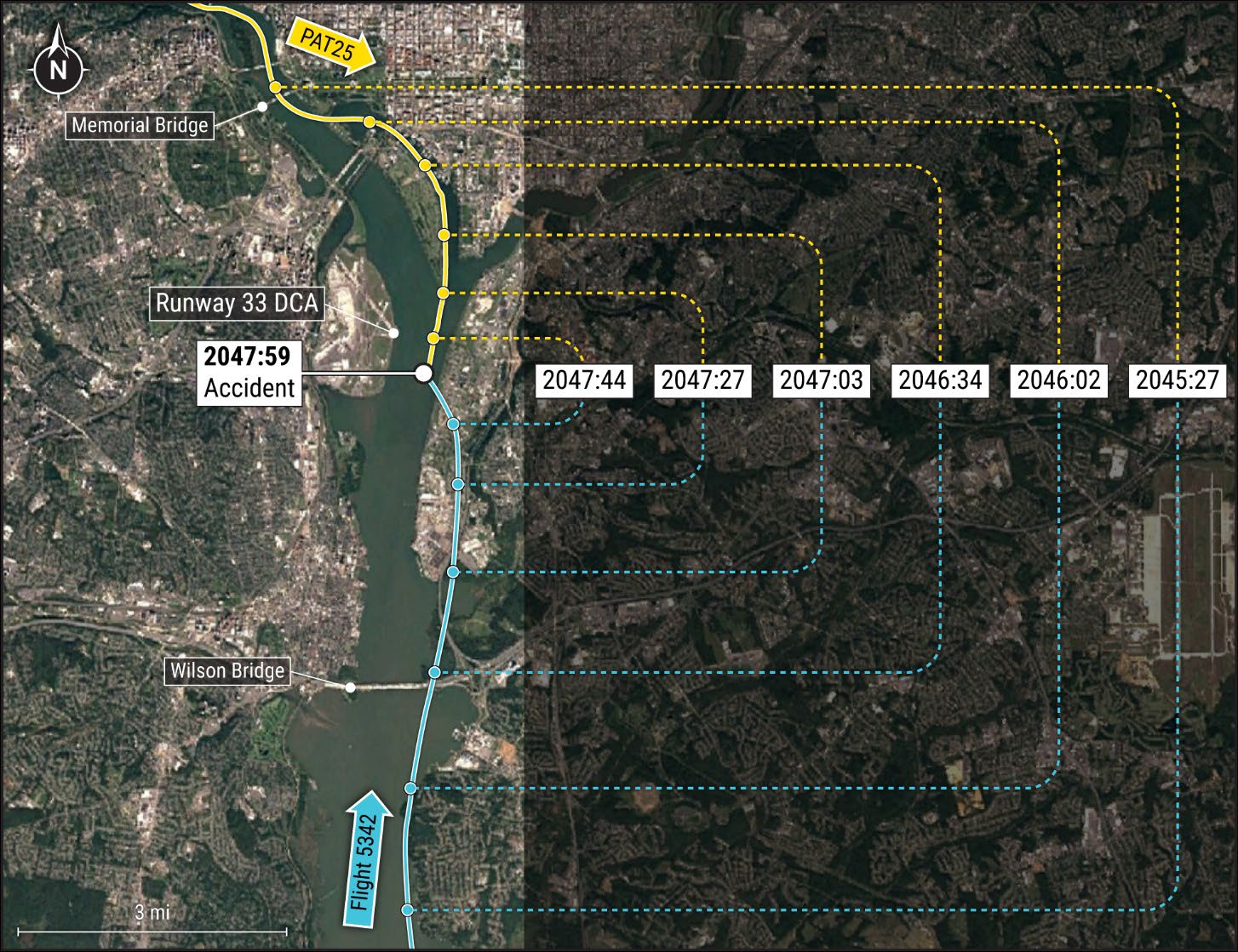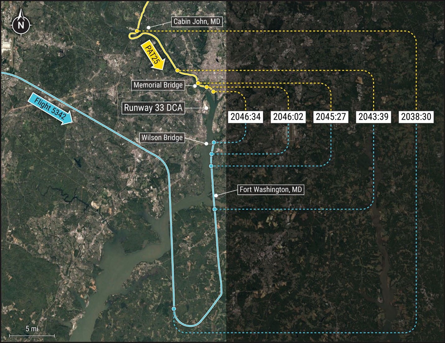 PAT25がルート1からルート4へ移行し、5342便がランウェイ33への旋回進入中、管制官はヘリコプター搭乗員に対してウッドロー・ウィルソン橋の南方にいる旅客機に関する交通情報を発出した。PAT25に搭乗していた技量評価操縦士(IP)は当該機を目視確認したとしてビジュアル・セパレーションを要求し、管制官はこれを承認した。