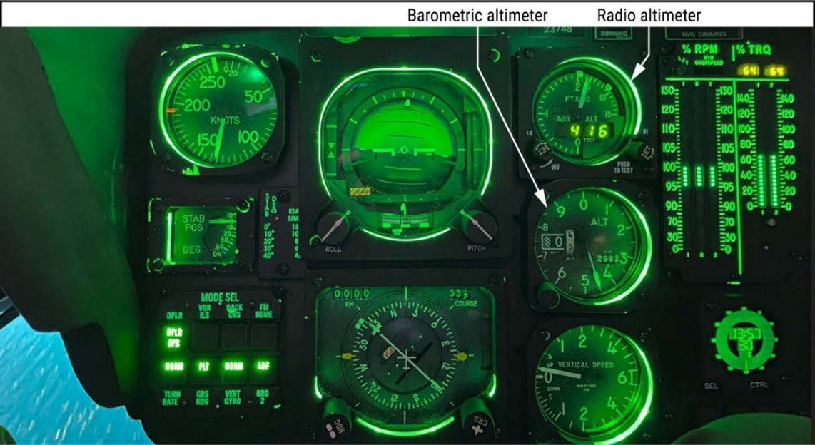 ヘリコプターのFDRは電波高度と「気圧高度」と標識されたパラメーターを記録していたが、後者は実際には地域気圧による補正を行っていない気圧高度(非補正値)であった。衝突はMSL278フィート(約85メートル)の高度で発生した。