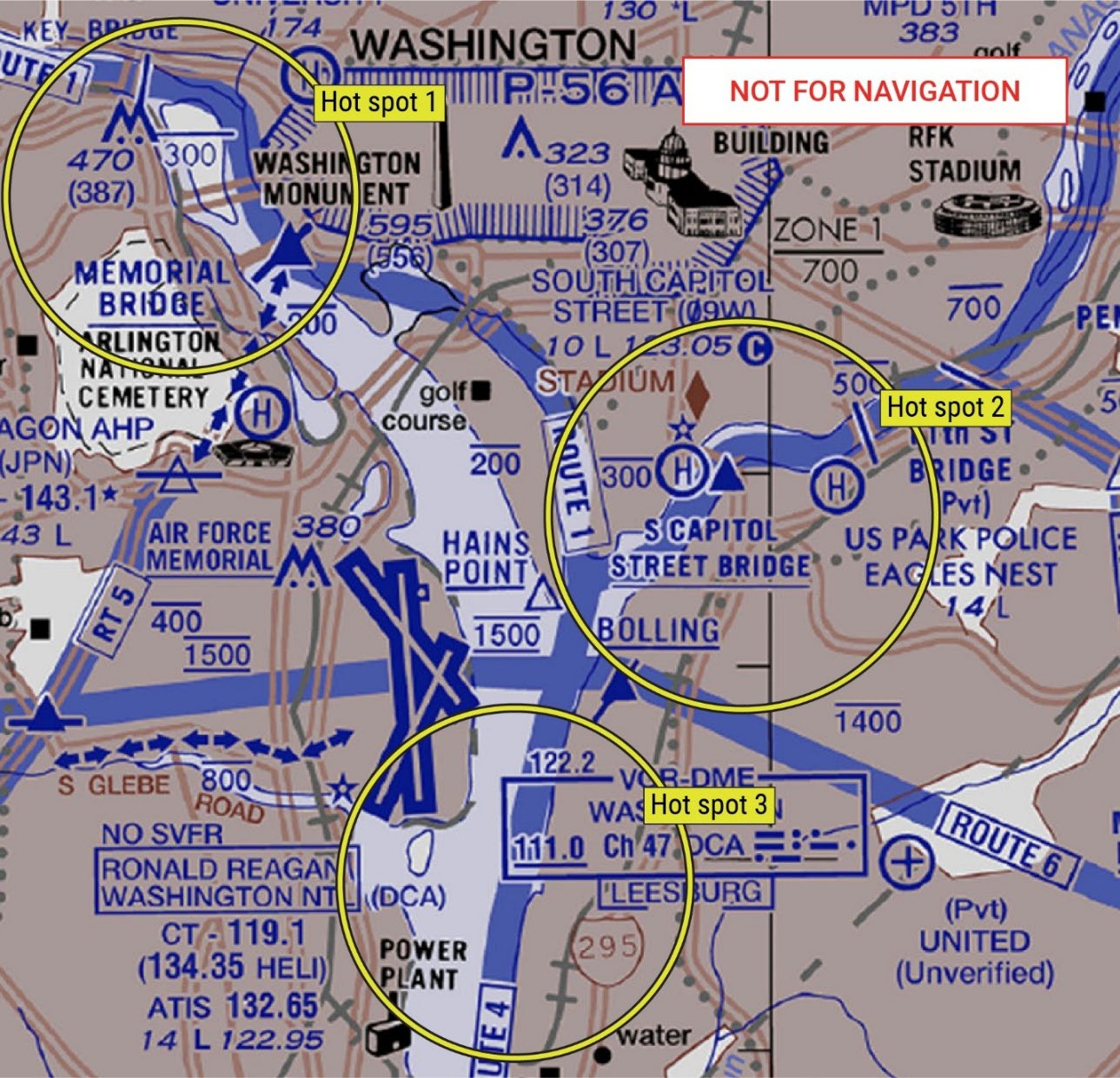 さらに、ワシントンD.C.のヘリコプター・ルートに関して公表された情報は、固定翼機・回転翼機の運航者や管制官が共通して完全にルートの制限を理解するには不十分であり、固定翼機用の航空図にはDCAの進入・出発経路と交差しうる近傍のヘリコプター・ルートが描かれていなかった。聴取を受けた米陸軍操縦士の大多数は、公表されたルート高度以下で飛行することがDCAへの到着・出発固定翼機から固有の分離を提供すると誤った前提を持っていた。
