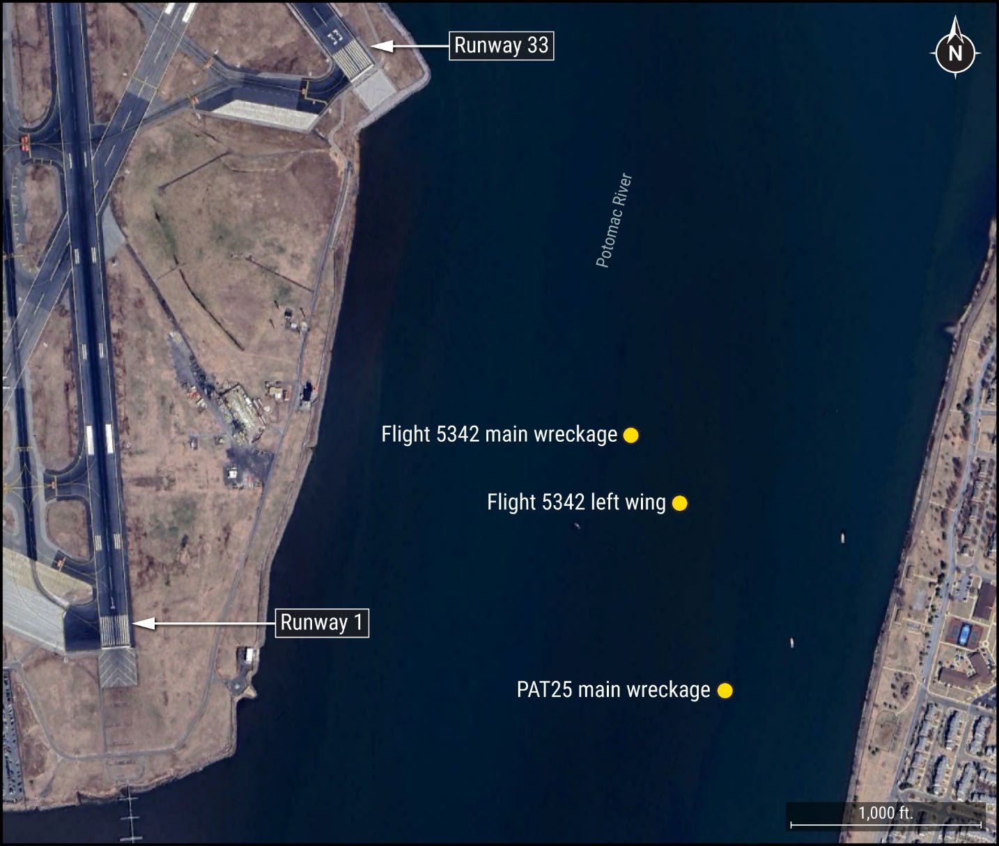 本報告書は、2025年1月29日に発生した空中衝突事故を論じるものである。事故は、米陸軍がコールサイン「PAT25(プライオリティ・エア・トランスポート・フライト25)」として運航したシコルスキーUH-60Lヘリコプターと、PSAエアラインズが5342便として運航した三菱重工業(MHI)RJアビエーション(旧ボンバルディア)CL-600-2C10(CRJ700)旅客機(機体番号N709PS)との間で発生した。衝突地点は、バージニア州アーリントンのロナルド・レーガン・ワシントン・ナショナル空港(DCA)の南東約0.5マイル(約0.8キロメートル)、ワシントンD.C.南西部のポトマック川上空であった。