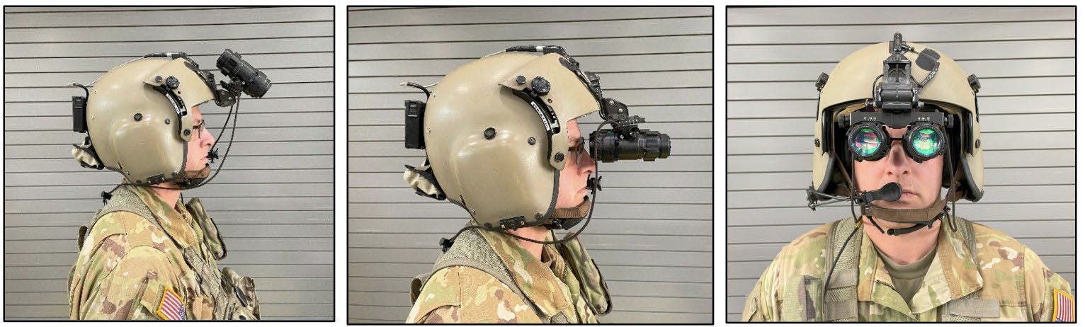 図26:AN/AVS-6ヘルメット装着型暗視眼鏡(NVG)を装着したパイロット。左の写真はNVGを上げた(非装着)状態、中央と右の写真はNVGを下げた(装着)状態。